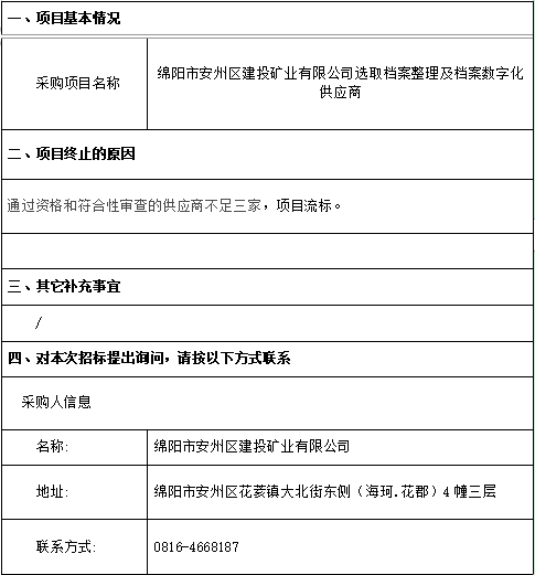 綿陽安州礦產(chǎn)資源集團(tuán)有限公司選取檔案整理及檔案數(shù)字化供應(yīng)商流標(biāo)公告