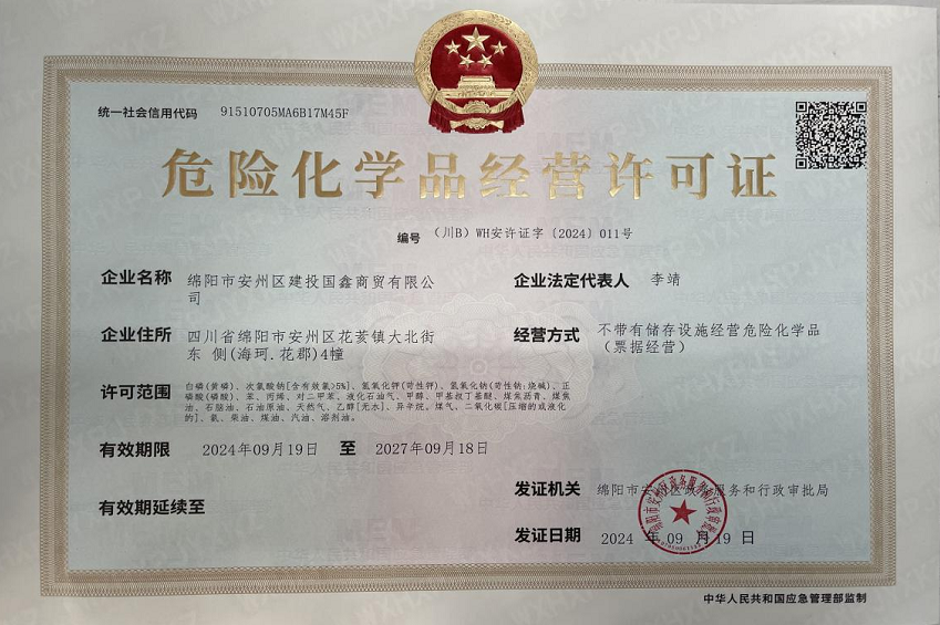 近日,綿陽安州礦產(chǎn)資源集團有限公司全資子公司綿陽市安州區(qū)建投國鑫商貿(mào)有限公司(以下簡稱“國鑫商貿(mào)”)順利取得《危險化學品經(jīng)營許可證》。